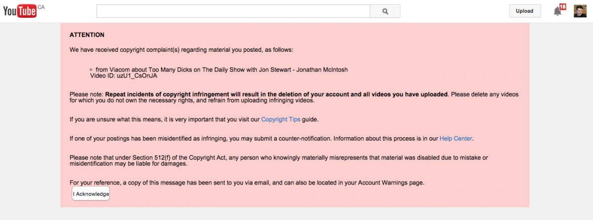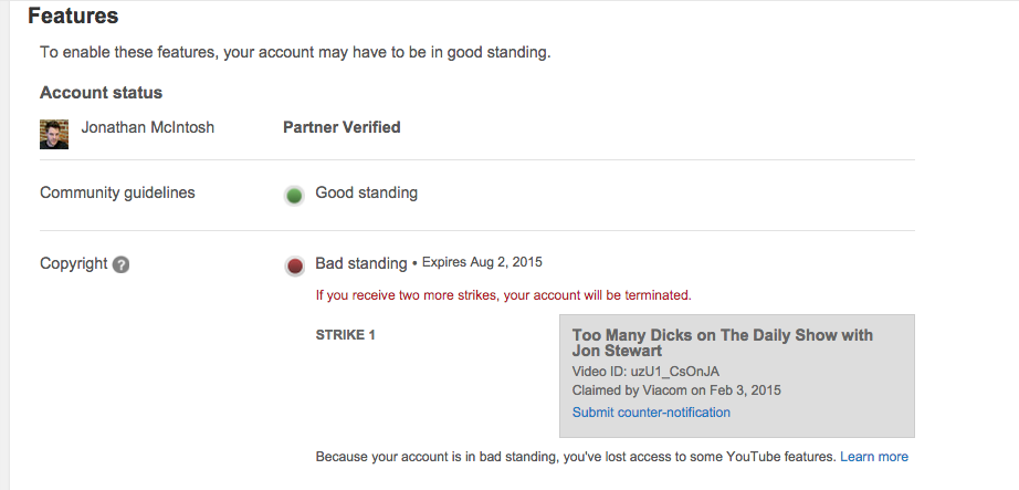 On February 3rd 2015 my remix video entitled "Too Many Dicks on the Daily Show" was removed from YouTube via a bogus takedown from Viacom claiming copyright infringement.
