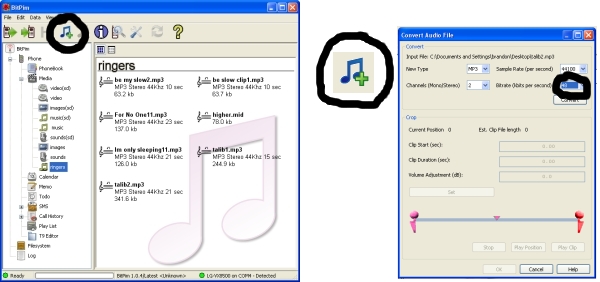 3. Import your audio into BitPim. Select "ringers" under the "Media" category, then choose "Add Ringer" from the tool bar at the top (the icon is a blue note with a green plus sign) and select your file. You must convert the file before going and further. BitPim sets the default Bitrate at 48, but you can set it higher. Most mp3's sold online are at a 128 bitrate so don't hesitate to bump that number up, your phone shouldn't have a problem handling it (BitPim may give you a standard warning that the file may be too big, but it isn't always accurate). You can also change the starting and stopping points for your ringtone at this point.