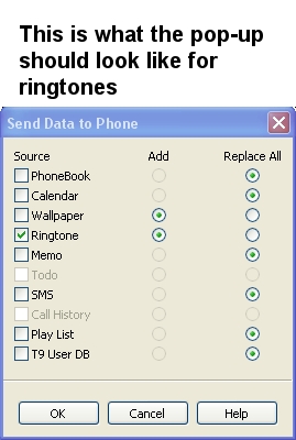 4. Send your ringtone to your cell phone. BitPim will send all of the ringtones in your "ringers" folder to your phone. You can either add the new ringtones to the existing ringtones on your phone, or you can replace your old ringtones with the new ones. Select "Send Phone Data" at the top of the tool bar (the icon is a green arrow pointing toward a cell phone). You should see a pop-up window with a number of check boxes. Check ONLY the "Ringtone" box and BE SURE it is set to "Add" and NOT "Replace All." Accidentally selecting "Replace All" for other items such as calender or address book COULD ERASE IMPORTANT DATA ON YOUR CELL PHONE.